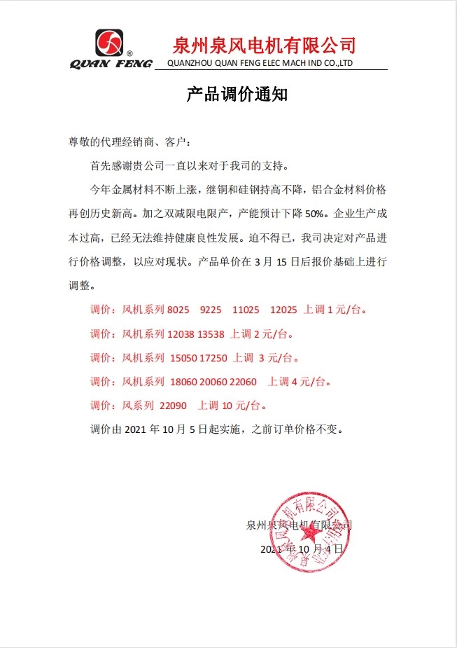 調價通知:繼2019年12月及2021年3月調價后,10月份再次調價